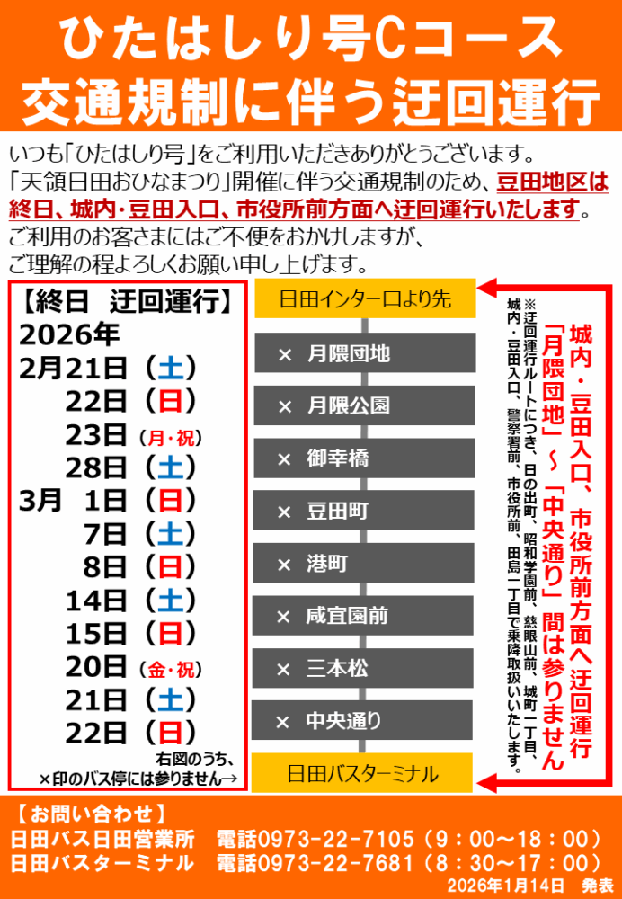天領日田おひなまつり開催に伴うひたはしり号Cコース迂回運行について