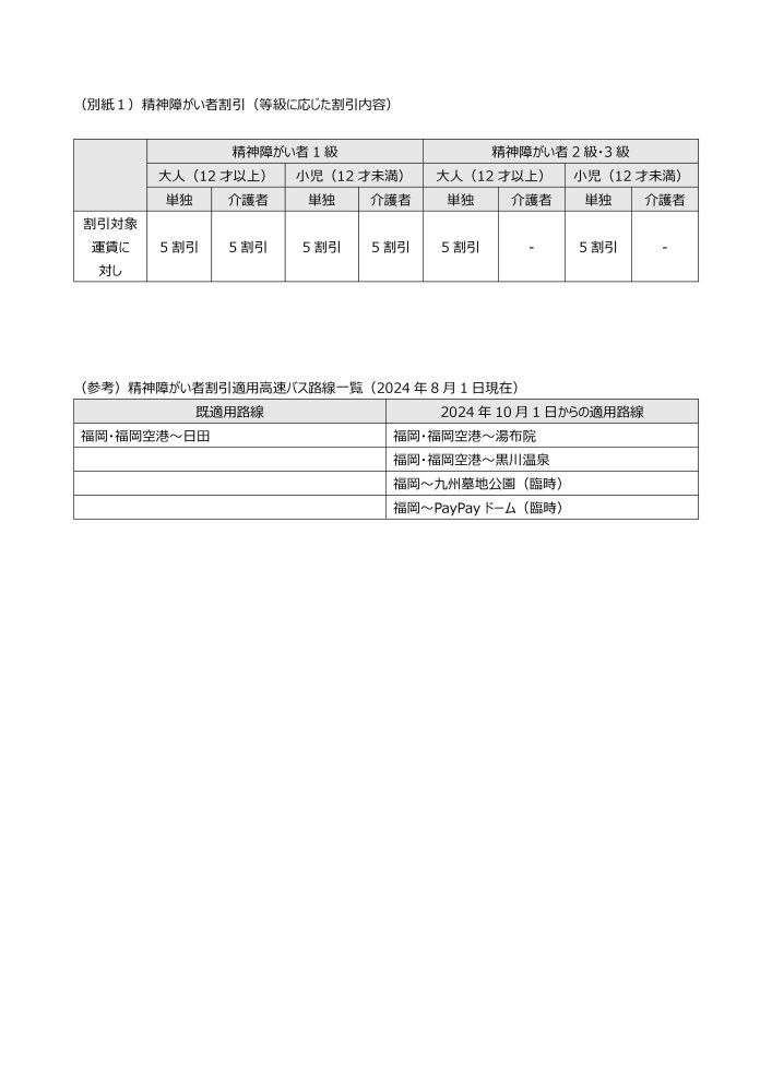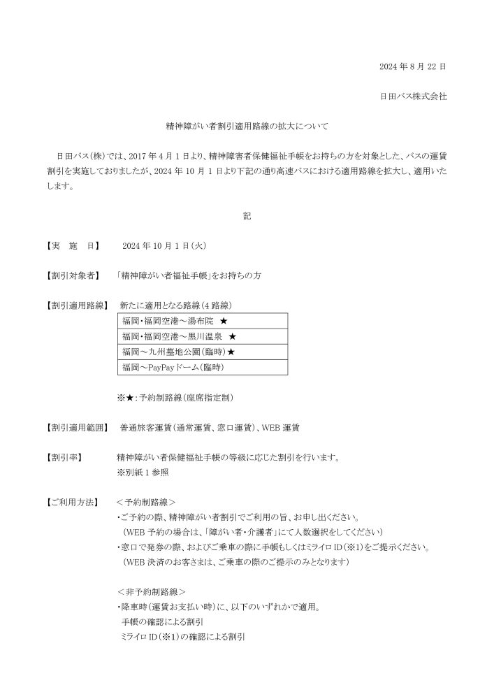 高速バス精神障がい者割引適用路線の拡大について