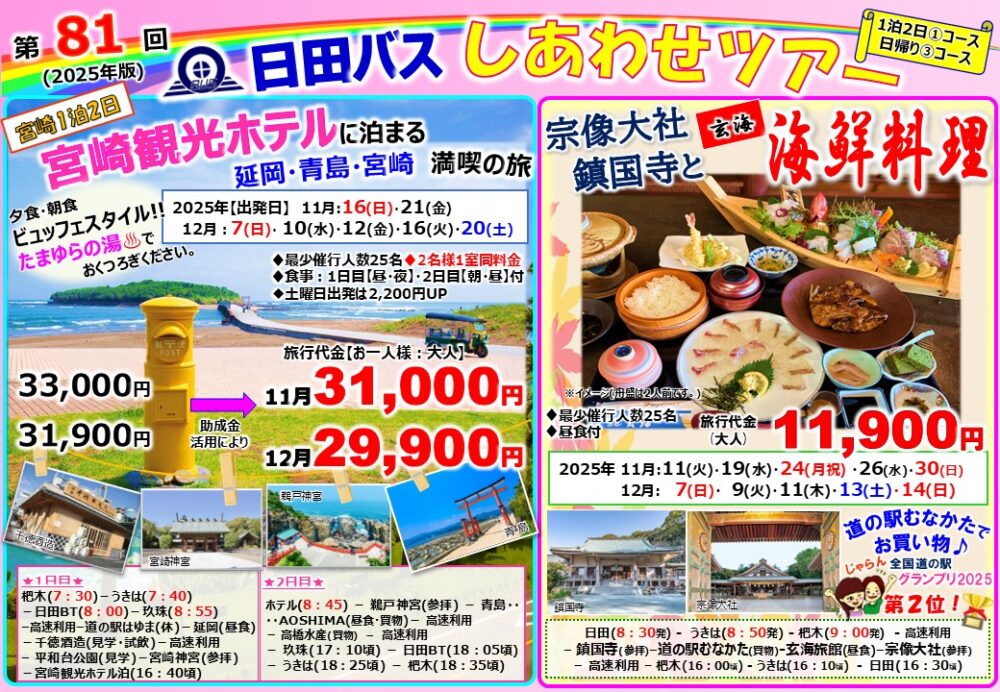 なんと!!2名1室でも同料金でオッケーです。大変お得ですね♪ 1日目は延岡の新鮮なお寿司の昼食と、千徳酒造での試飲、平和台公園、宮崎神宮参拝ができます。2日目は、鵜戸神宮、青島散策できます。青島では「しあわせな黄色のポスト」もあります。新しくなった青島も楽しみですね♪延岡の高橋水産では、海産物のお買物もできます。